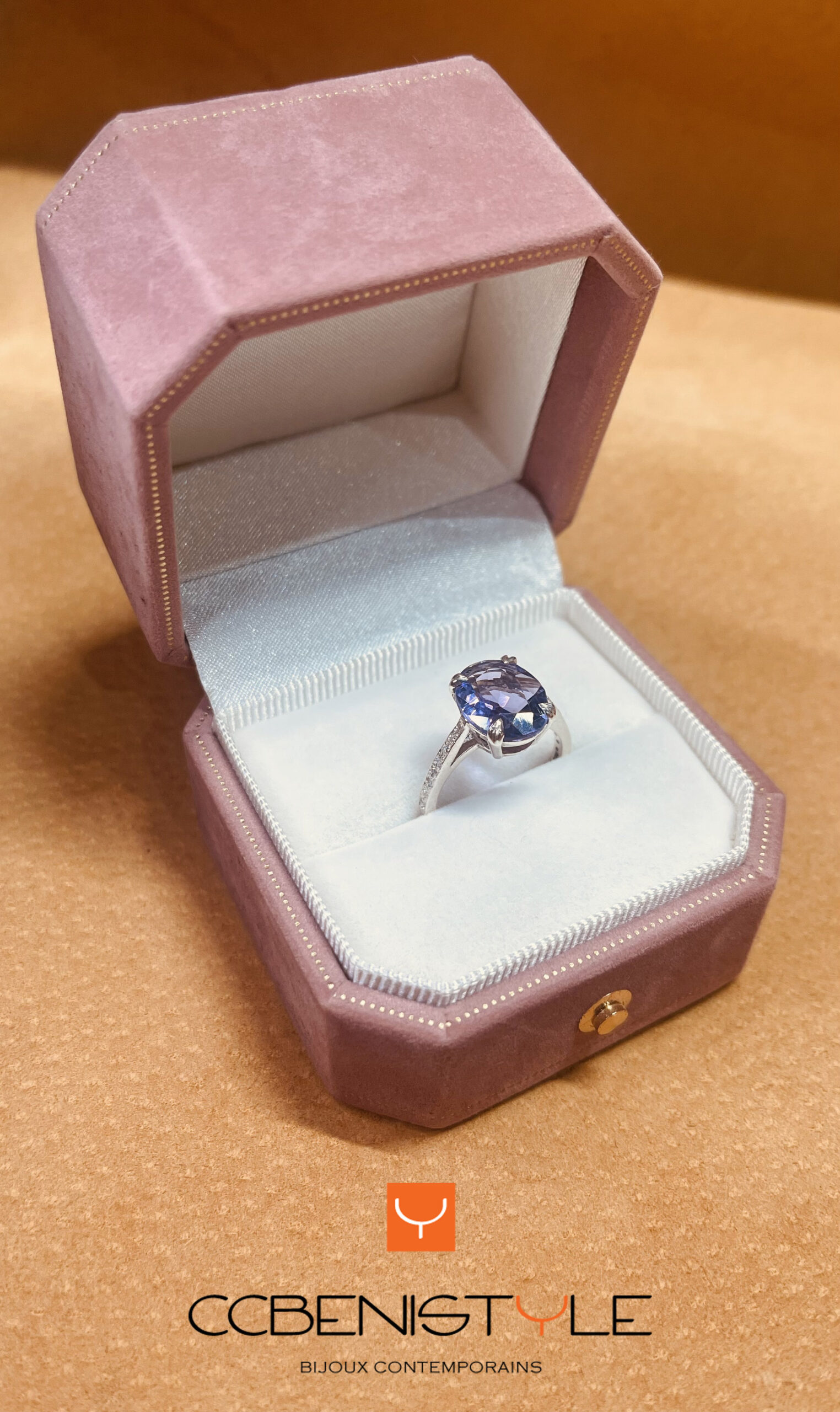 Elle est sertie d’une améthyste du Brésil soigneusement sélectionnée pour la profondeur de sa couleur, maintenue par un sertissage à griffes façonnées individuellement, au dessin délicat évoquant des cœurs.